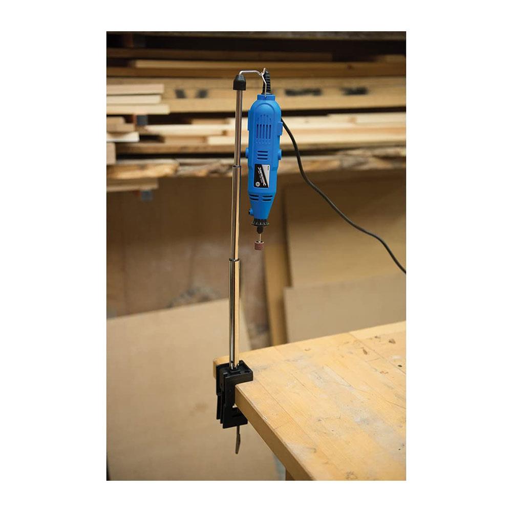 This rotary tool hanging stand has a steel desk edge clamp with an adjustable telescopic shaft.  This sturdy stand keeps the rotary tool within easy reach on a rotating hook at the most appropriate height for each user.  The telescopic stand can be clamped onto a bench or permanently mounted using the pre-drilled holes. Compatible with most rotary tools including Silver, GMC, and Dremel.