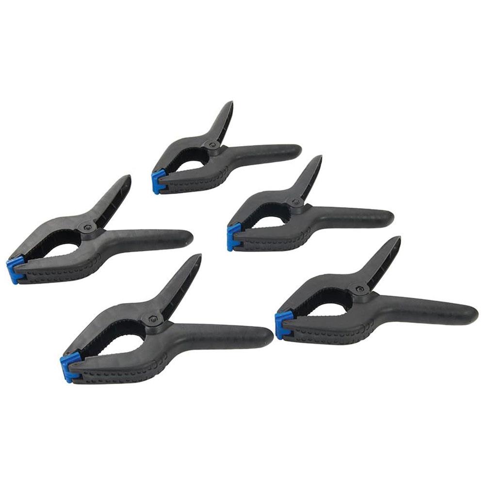 Serrated jaws provide a non-slip grip on the work piece or object and soft-grip rotating jaw pads ensure delicate surfaces are not damaged. Durable plastic contoured jaw-end grips and non-slip handles make for comfortable, easy use and operation. This pack of 5 x Spring Clamps are ideal for woodworking, craft, model making and hobby projects.