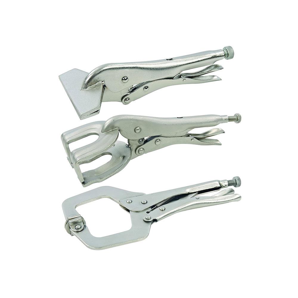 Nickel-plated steel for corrosion resistance. Adjustable opening and quick-release lever. Includes: 240mm sheet metal clamp, 280mm welding clamp and 275mm C-clamp pliers.