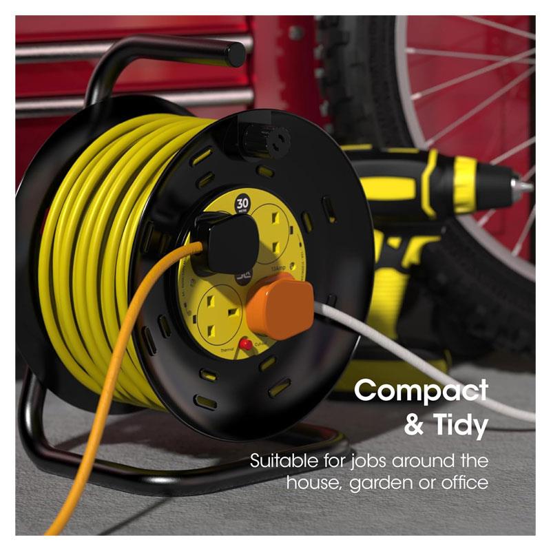 Unwind up to 30 metres of cable for maximum flexibility—ideal for use with lawnmowers, power tools, outdoor lighting, and more. Perfect for construction sites, workshops, or general household use.