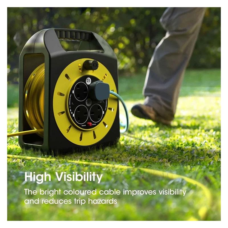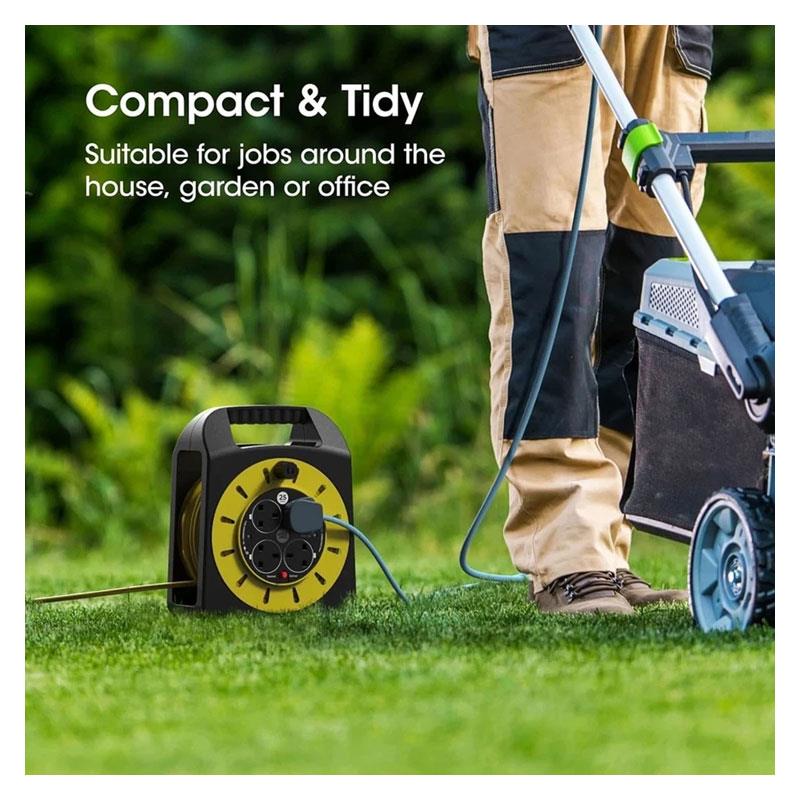 • 25 Metre Cable Length — Reach power easily in large gardens, garages, or workshops.