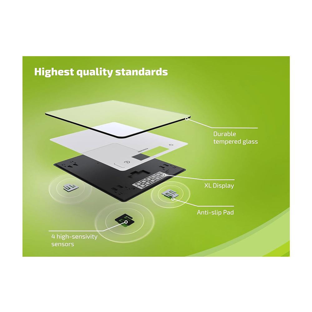 A highlight in any kitchen: with its ultra-slim design, the Page Comfort 300 Slim kitchen scale can be stored in any cupboard or drawer. This chic scale has an extra-large LCD display that shows weights of up to 10 kg in precise 1 g increments. Complex recipes with a long list of ingredients pose no problem for this digital kitchen scale; its tare function makes it easy to add another ingredient at any time. The patented Sensor Touch and large weighing surface can accommodate the largest of bowls and pans with multiple ingredients and the automatic switch-off function is just as impressive. When the Page Comfort 300 Slim is not in use, it switches off all by itself. Not only does that save on energy, it also ensures a long life for the batteries, which are included. And even the smallest members of the family have not been left out – the battery compartment secured firmly with screws ensures the scale is childproof.