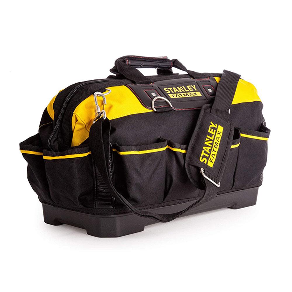 The Stanley FatMax Tool Bag is made with heavy-duty 600 denier fabric with leather reinforcements for long-lasting durability. It offers maximum tool protection thanks to its rigid and waterproof plastic bottom. An ergonomic rubber grip carry handle and heavy-duty shoulder strap make lifting more comfortable. The open structure makes for quick and easy tool access and there is a removable divider with a belt clip. The interior tool loops keep everything in place.