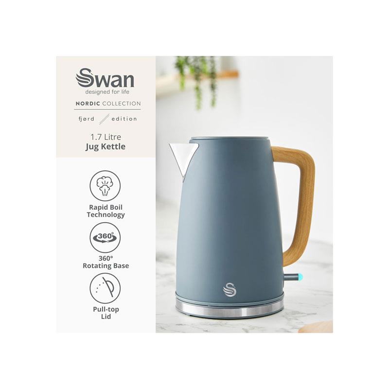 Bring a blend of Scandinavian simplicity and modern functionality to your kitchen with the Swan Fjord 1.7L Electric Jug Kettle. Designed with a smooth grey finish and a contemporary wood-effect handle, this kettle adds warmth and elegance to both modern and traditional décor.