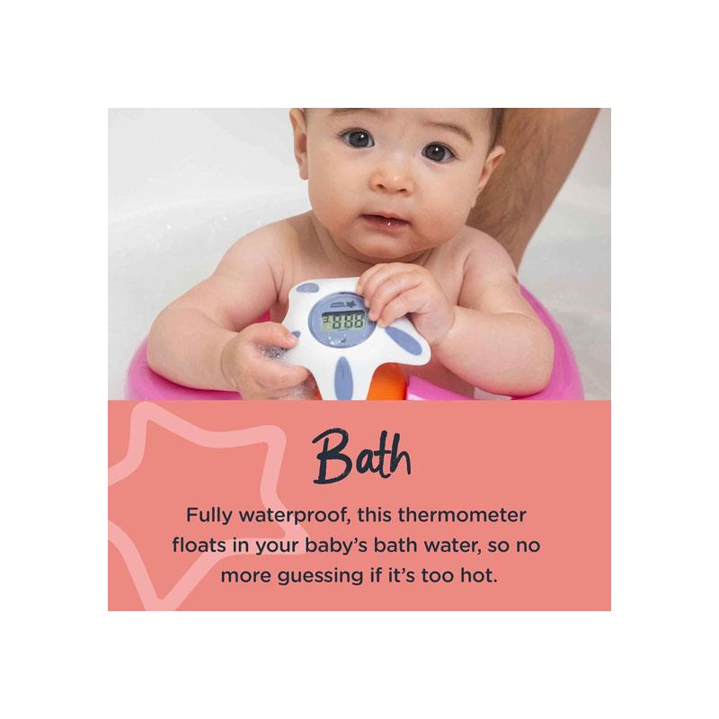 • Dual-use thermometer: Measures both bath water and room temperature for complete comfort and safety.
