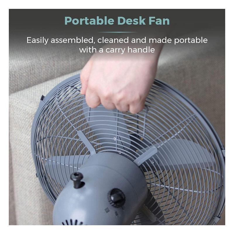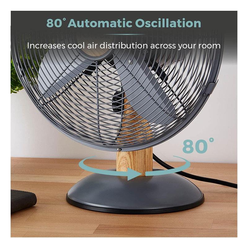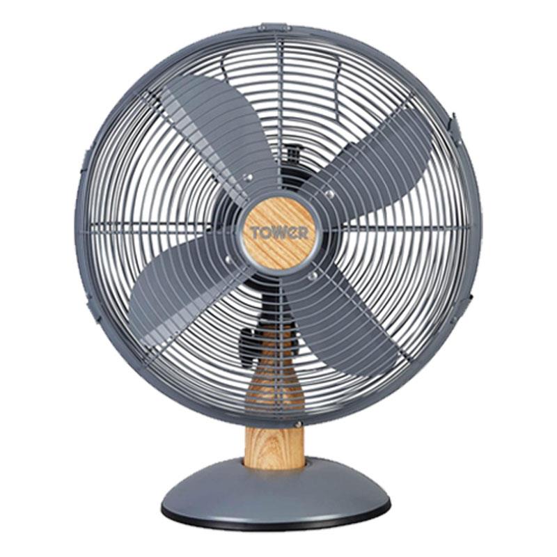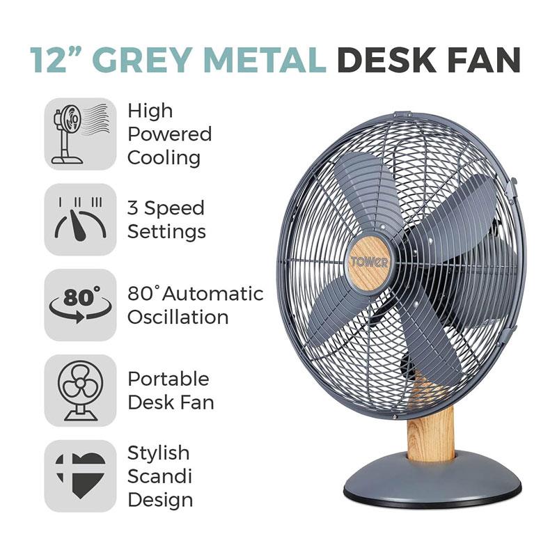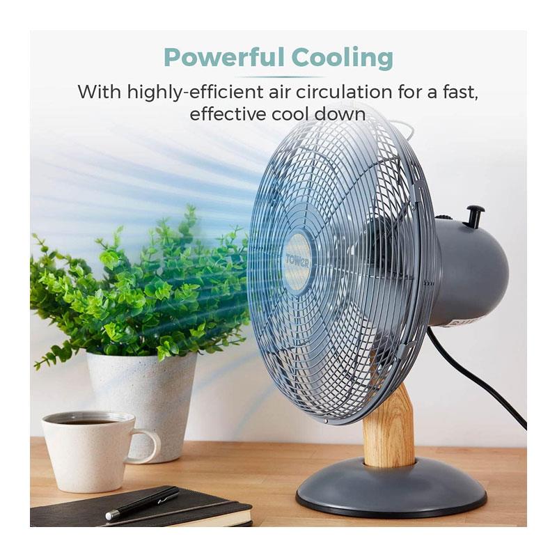 Tower 12 Inch Scandi Metal Desk Fan – 3 Speed Settings, 35W, Grey & Wood Effect