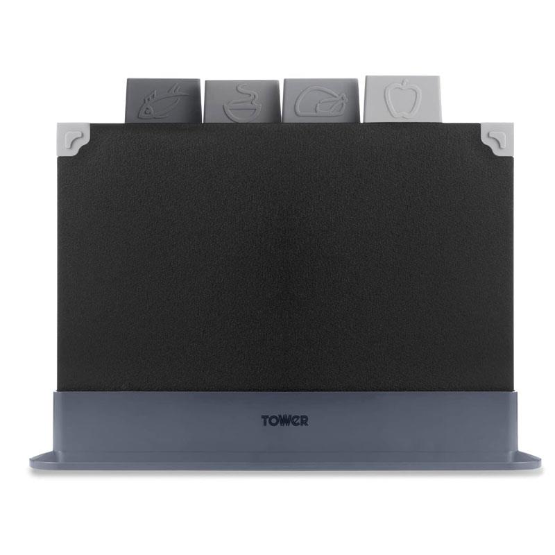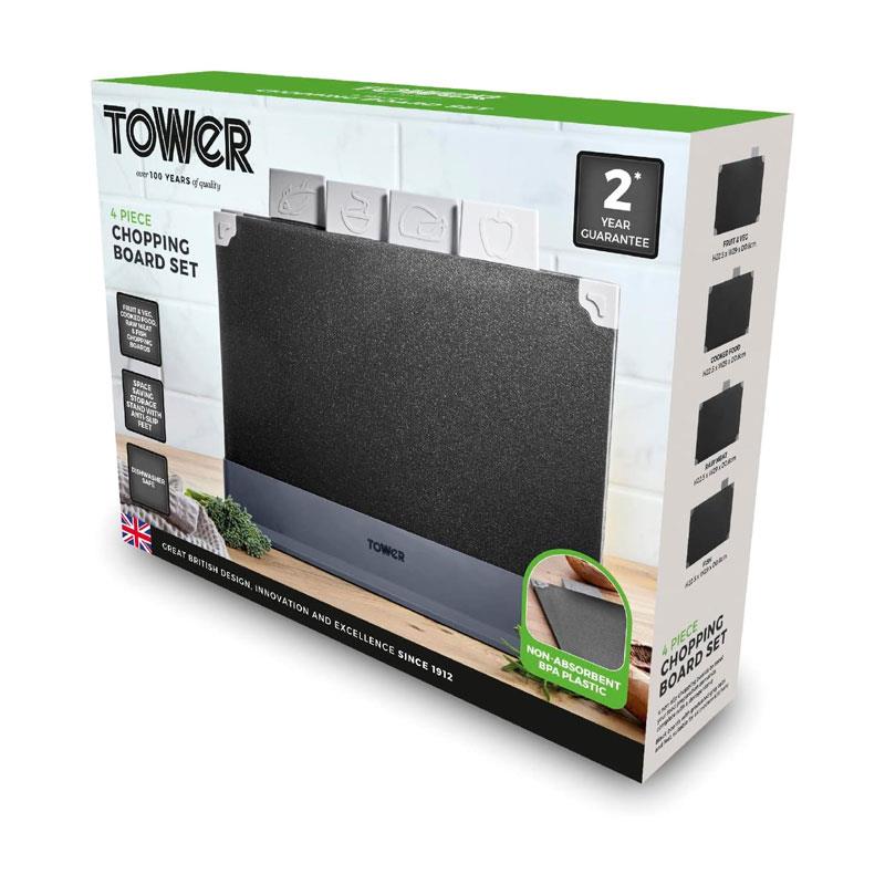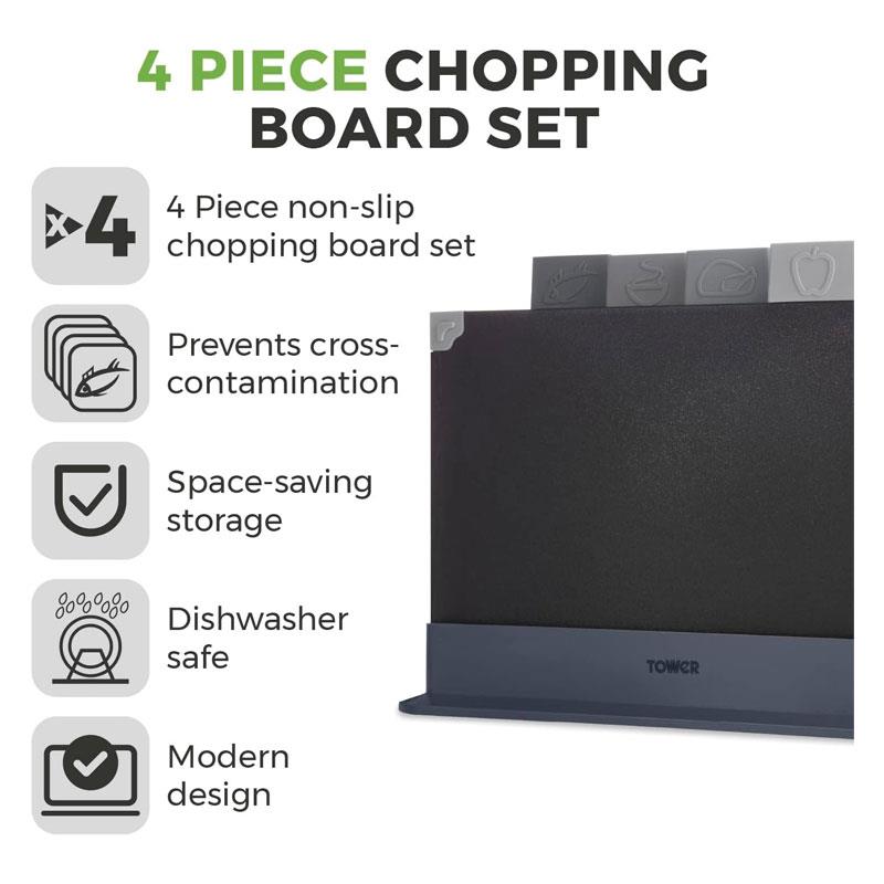 Tower 4 Piece Chopping Board Set with Stand – Black | Durable, Non-Slip & Dishwasher Safe