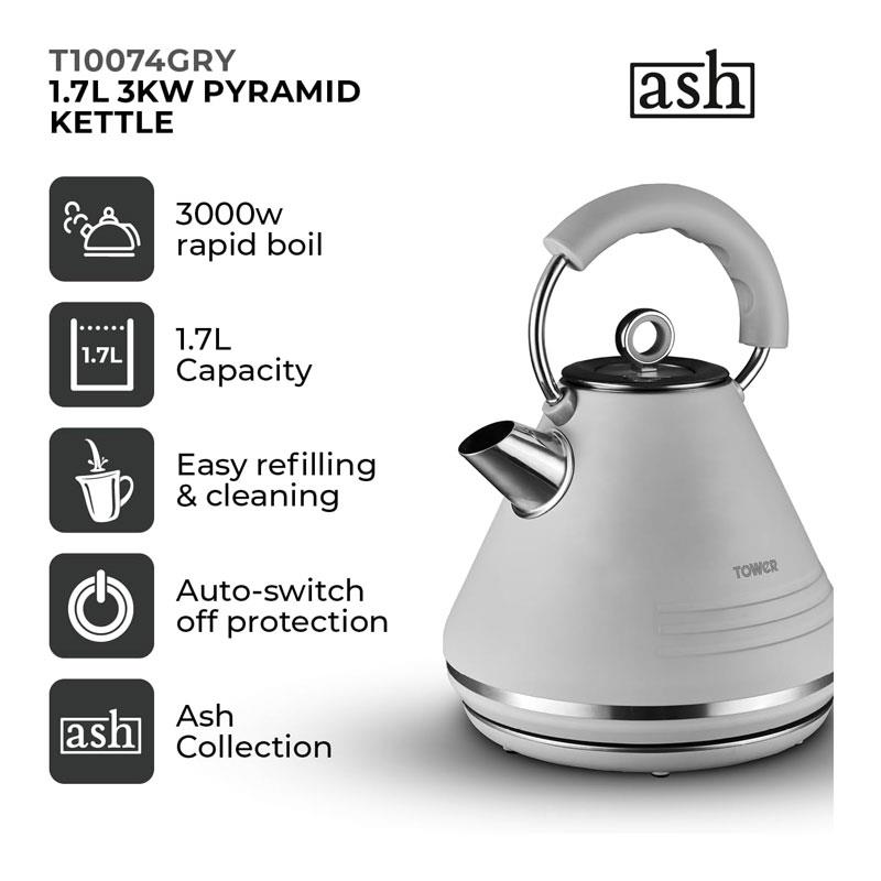 Tower Ash Matte Pyramid Kettle Chrome Accents 3000W 1.7 Litres – Grey