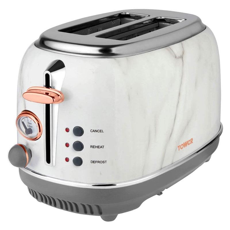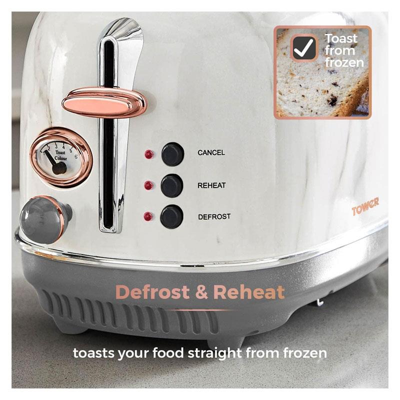 Tower Bottega 2 Slice Toaster – White Marble & Rose Gold | 850W Stainless Steel Toaster with Adjustable Browning, Defrost & Reheat Functions