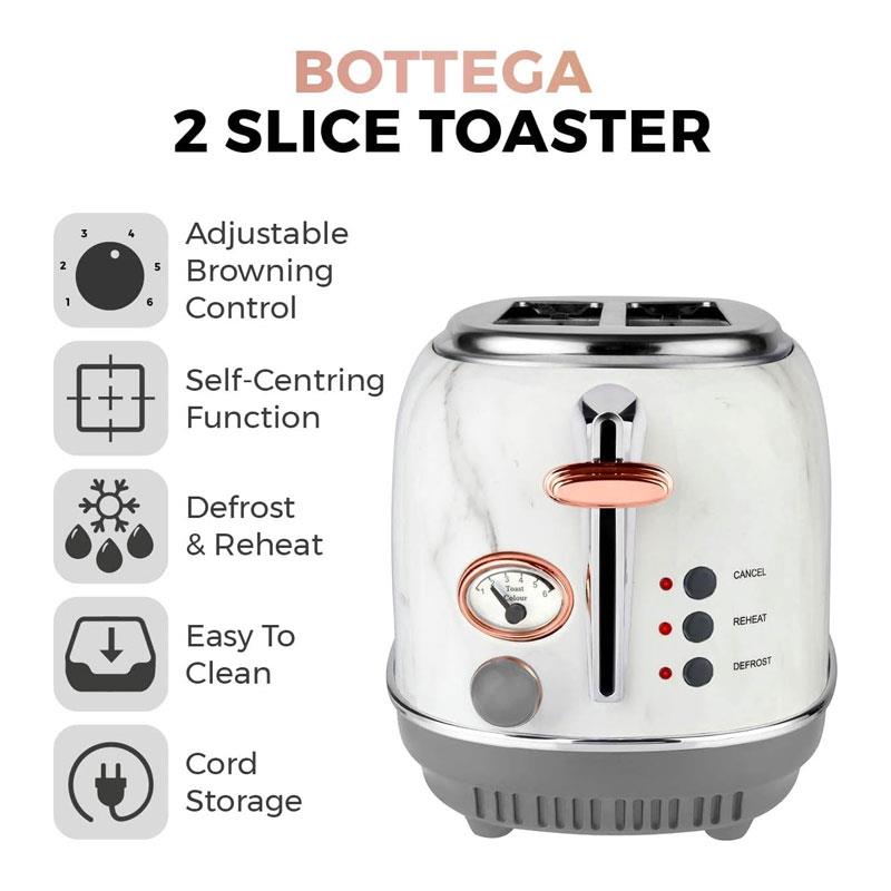 Elevate your morning routine with the Tower Bottega 2 Slice Toaster, a stylish and functional addition to any modern kitchen. Featuring a premium white marble finish with rose gold accents, this elegant toaster blends timeless design with practical performance—perfect for toasting bread, crumpets, muffins, and bagels to golden perfection.