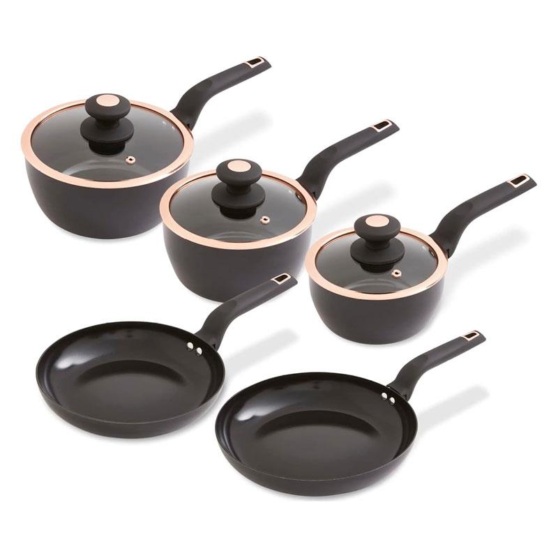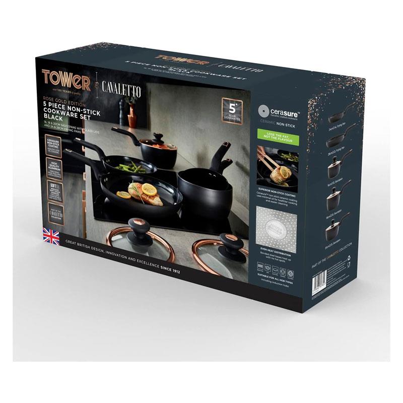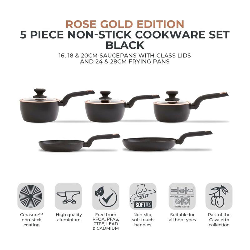 Tower Cavaletto 5 Piece Cookware Set 16cm 18cm 20cm Saucepans 24cm 28cm Frying Pans – Black & Rose Gold