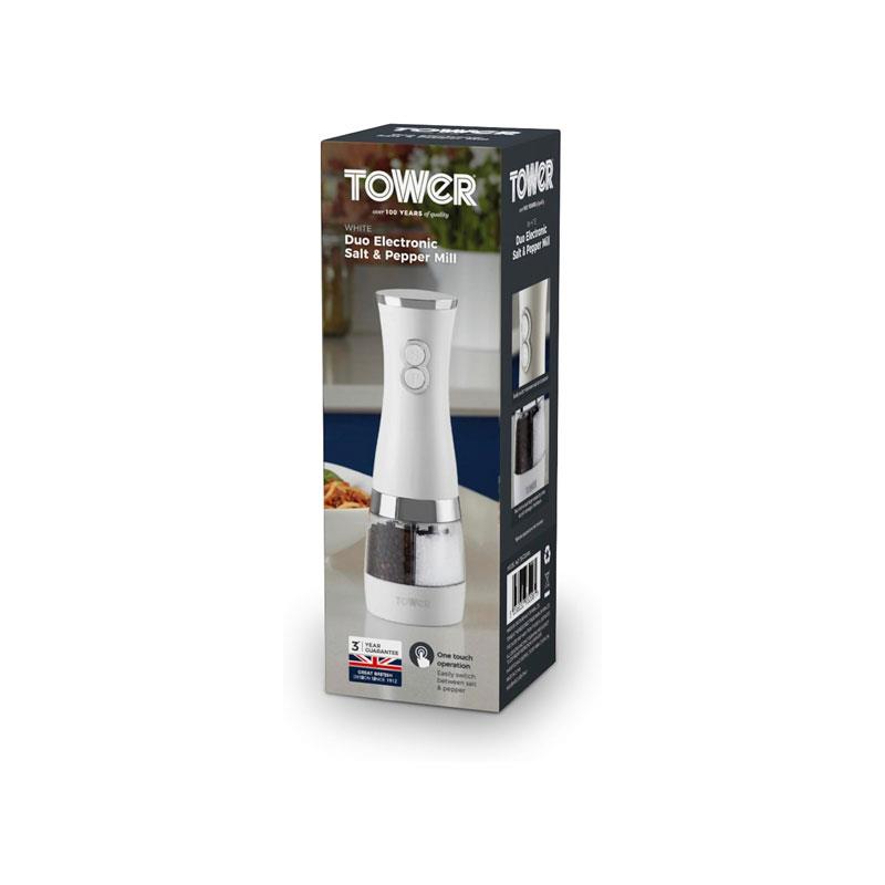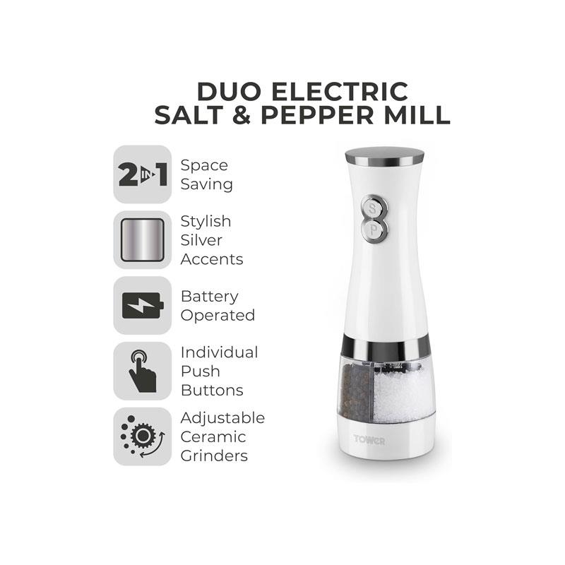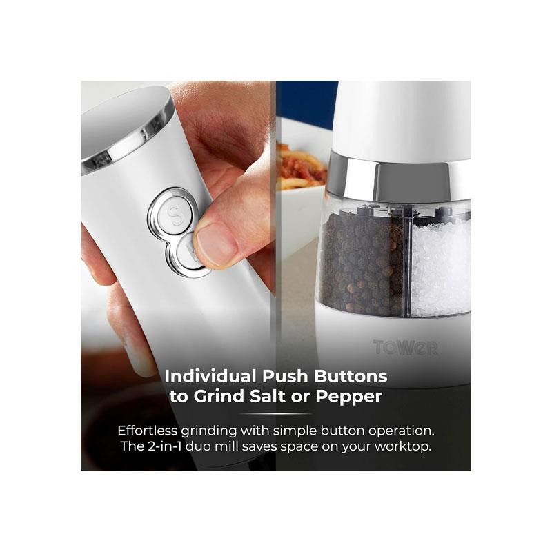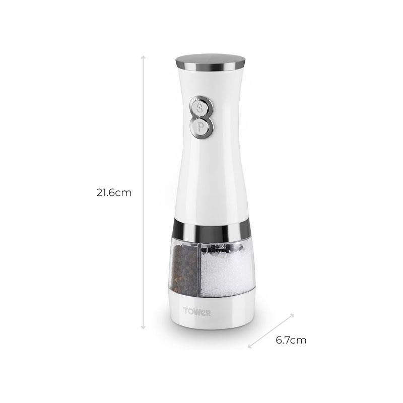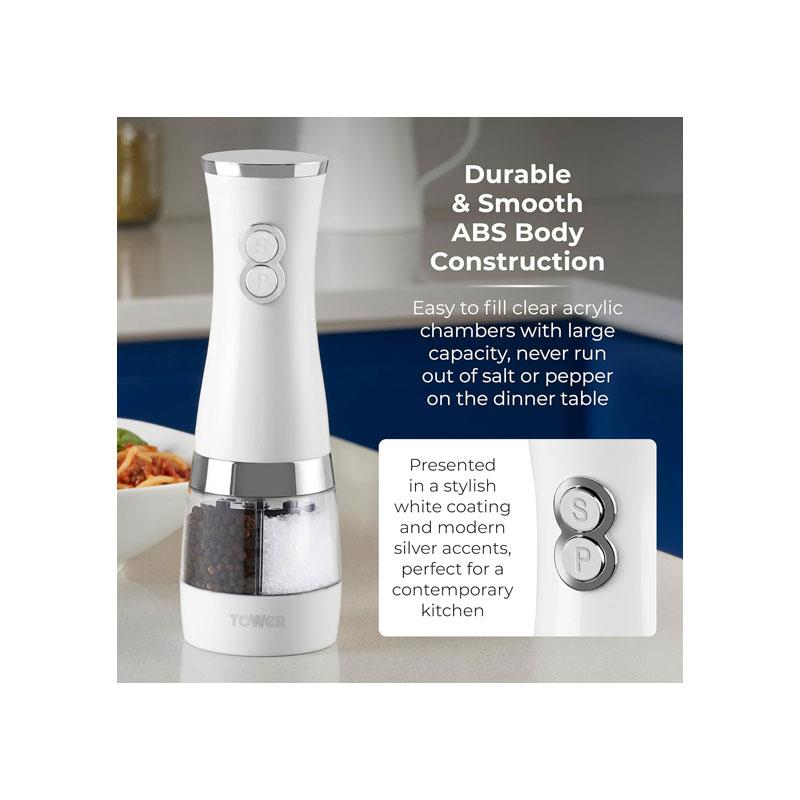 Home / Home & Kitchen / Homeware & Cookware / Accessories/Utensils / Tower Duo Electric Salt And Pepper Mills Battery Operated Adjustable Ceramic Grinders with ABS Body White/Chrome
