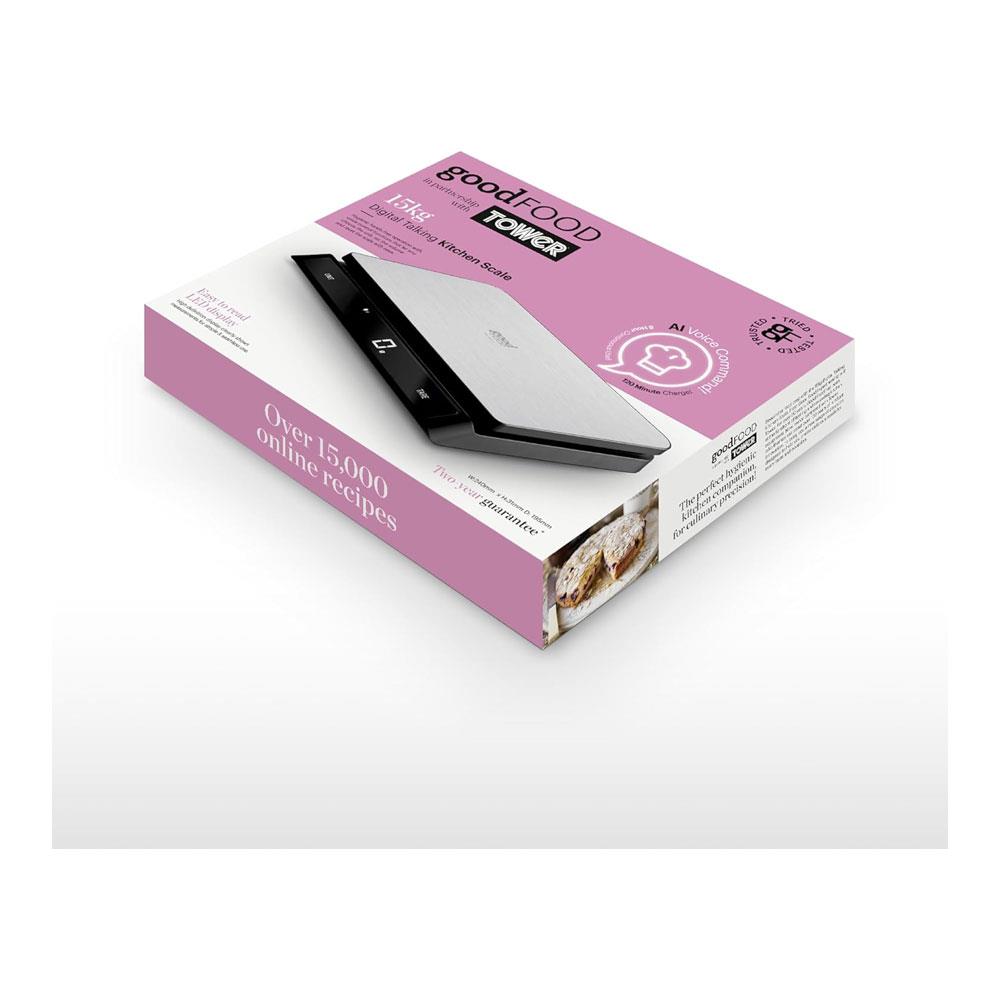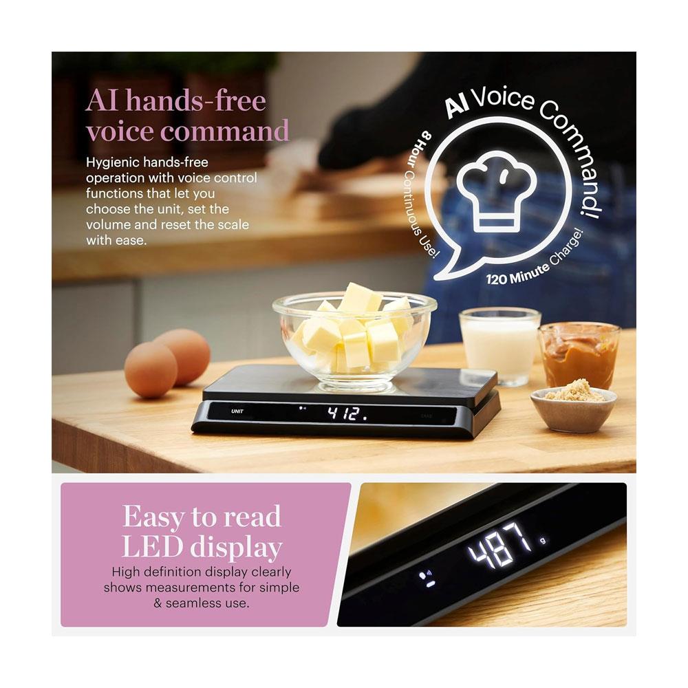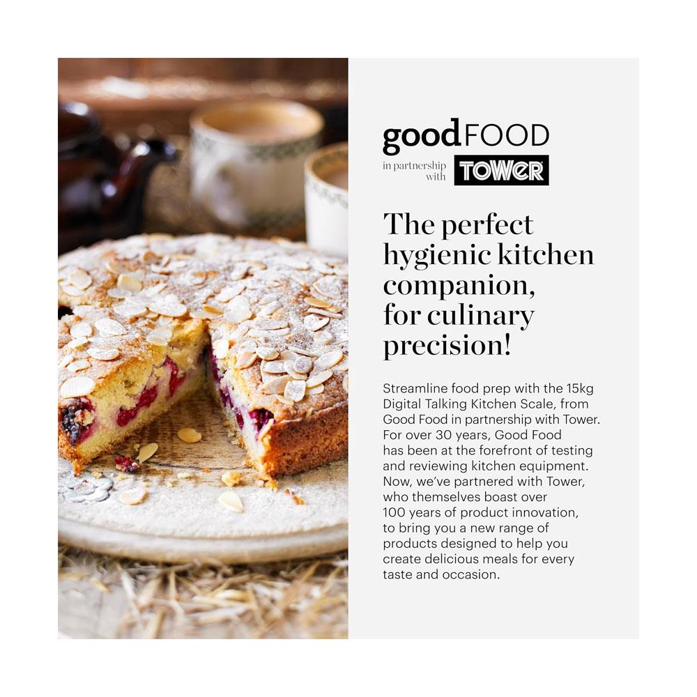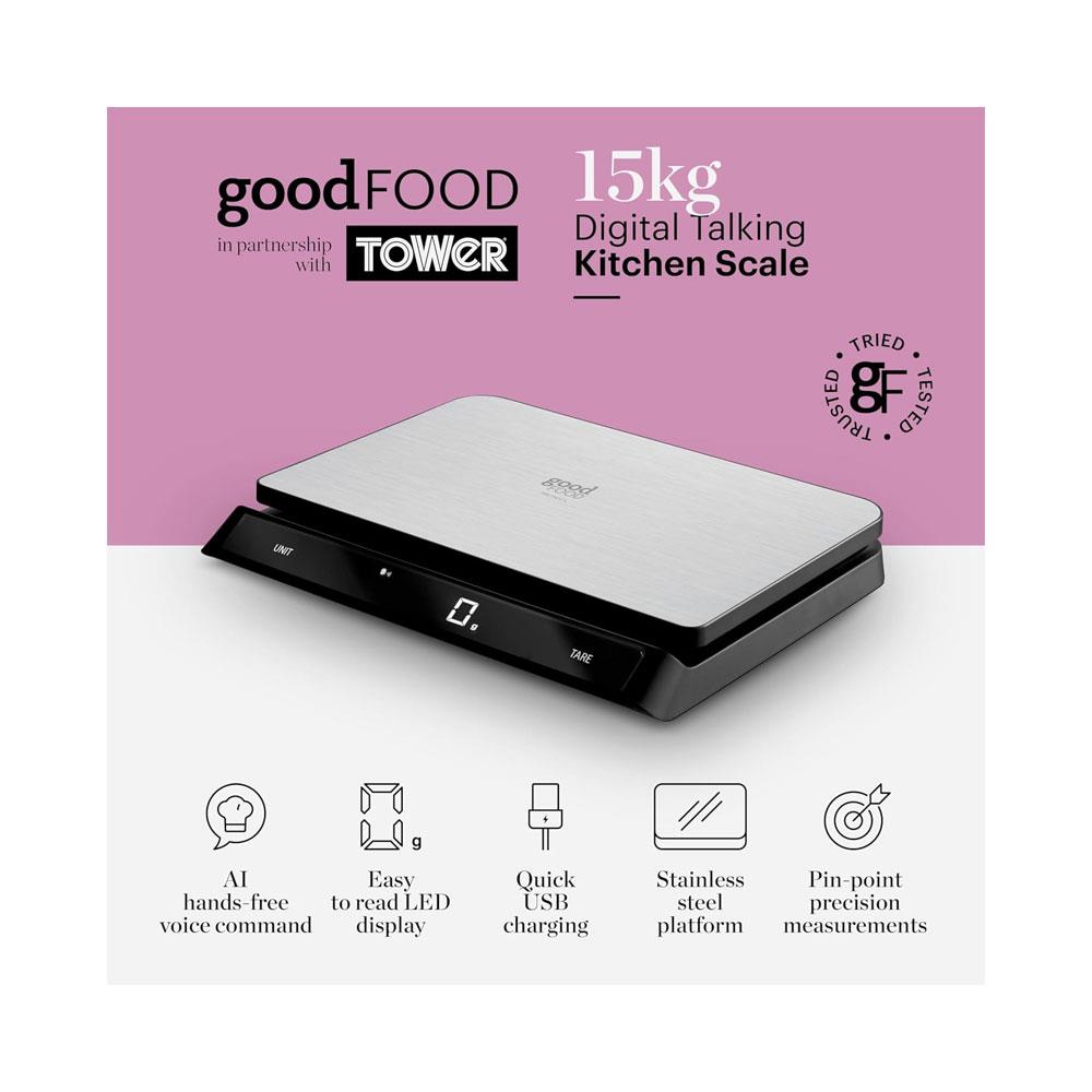 Tower Good Food Intelli Kitchen Scale – Voice Control, LED Display, USB Rechargeable – 15kg Capacity – Black/Silver