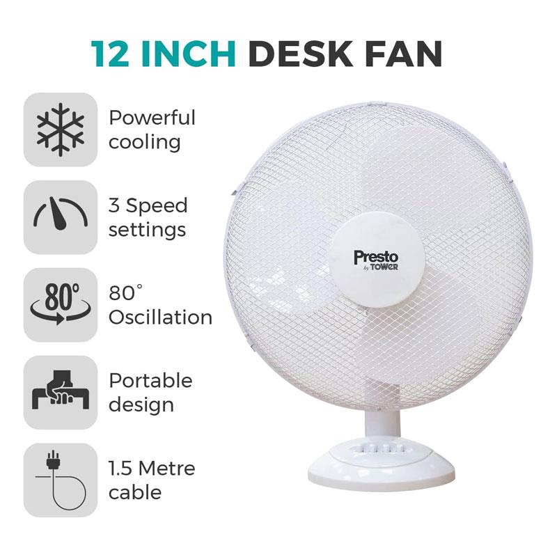 Tower Presto 12 Inch Desk Fan 3 Speed Settings 80° Oscillation 35W – White