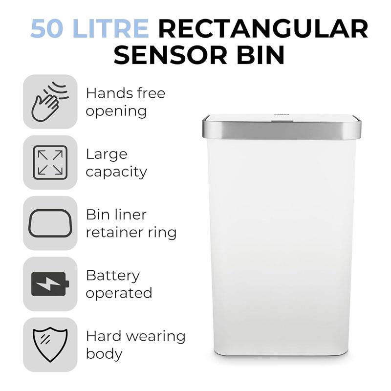 Tower Rectangular ABS Sensor Bin 50 Litres Bin Liner Retainer Ring Durable PP Body Stainless Steel Trim White - Image 2