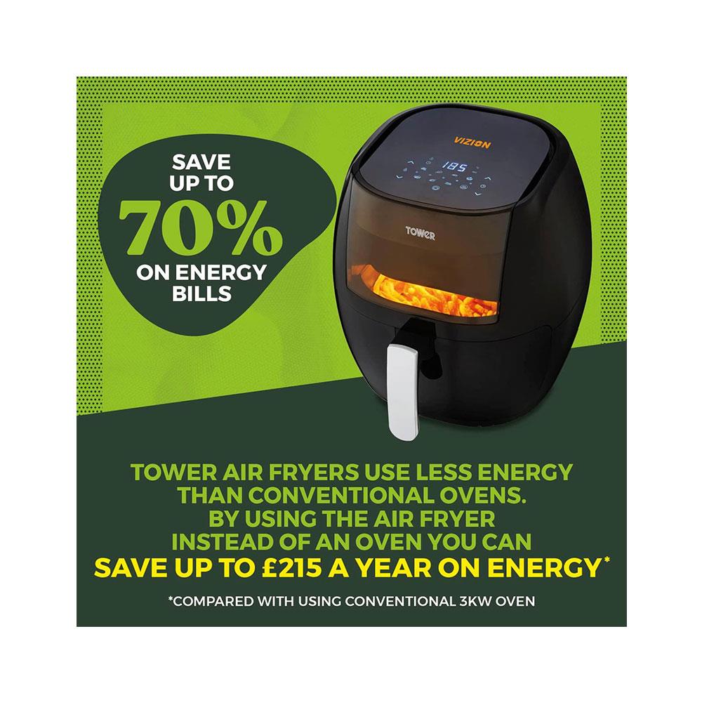 Cooking food 30% faster, Tower Air Fryers use less power than conventional ovens. Save up to 50% on your energy by simply switching to Air Fryer cooking