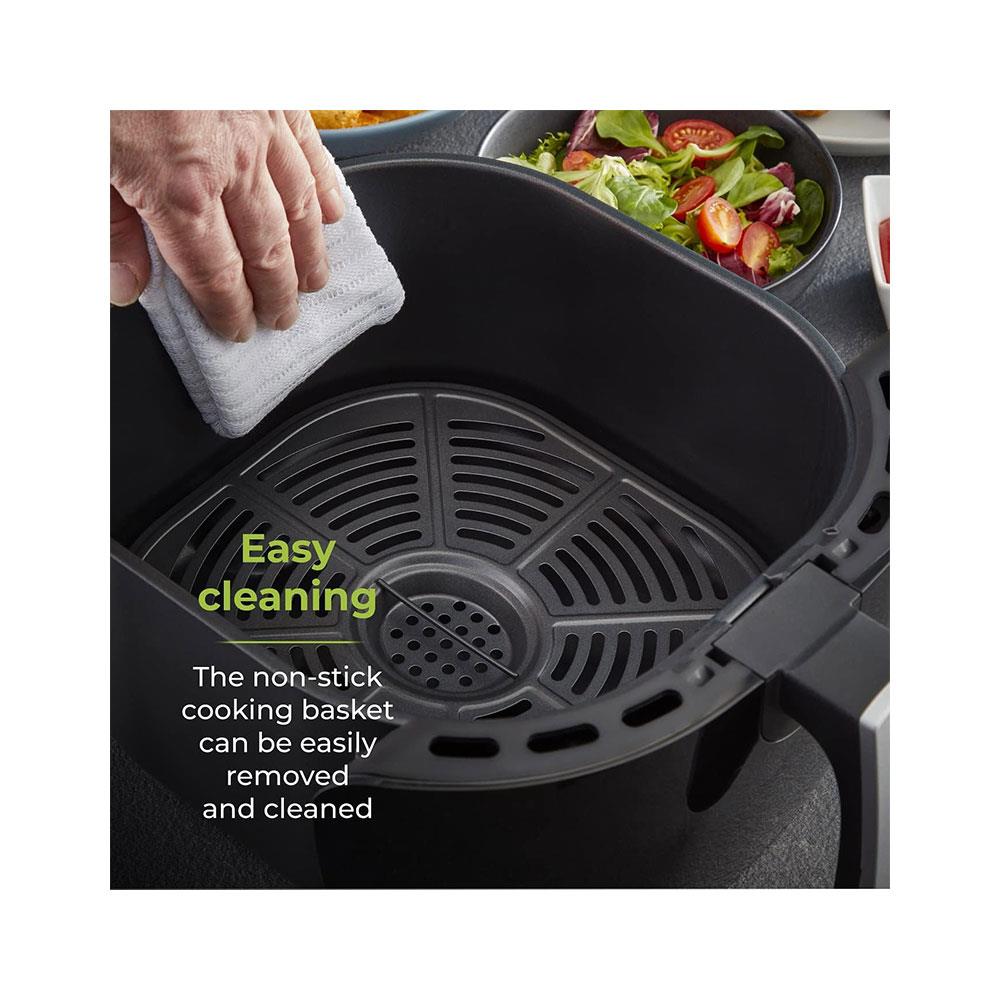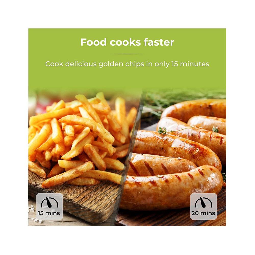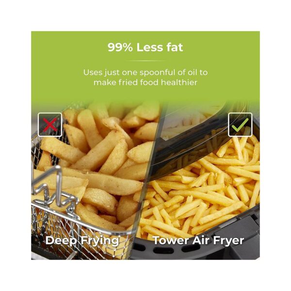Uses Tower’s rapid air circulation technology to cook your food 30% faster with 99% less oil and uncompromised fried taste – you lose the fat, not the flavour