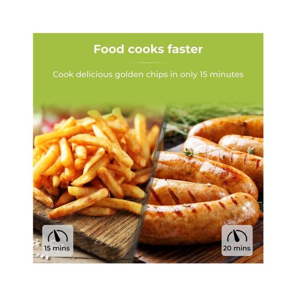 • Works quicker than a conventional oven, cooking chips in as little as 15 minutes