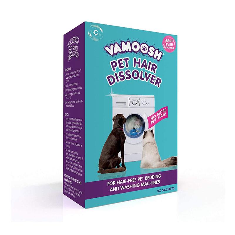 Say goodbye to stubborn pet hair with Vamoosh Pet Hair Dissolver, the world’s first pet hair remover designed specifically for washing machines. Each 100g sachet works by dissolving pet hair during hot washes (85-95°C), leaving your pet bedding and washing machine clean, fresh, and hair-free.