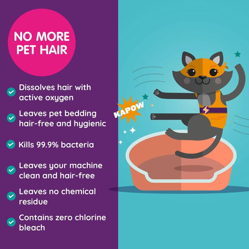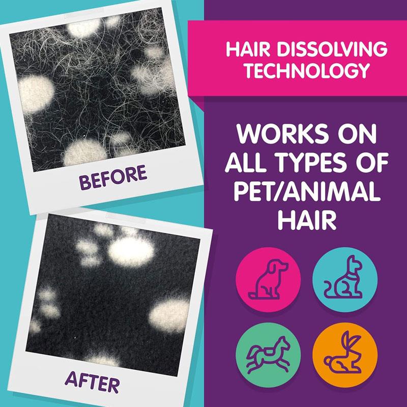 • Dissolves Pet Hair Effectively: Uses patented active oxygen technology to break down keratin in pet hair, dissolving it completely during the wash cycle.