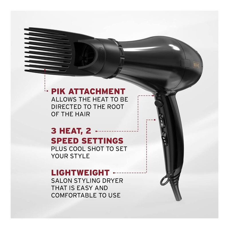 Wahl PowerPik 3000 Hair Dryer – 1800W Ionic Blow Dryer for Afro and Textured Hair with Pik Attachment & 3 Heat Settings – Black